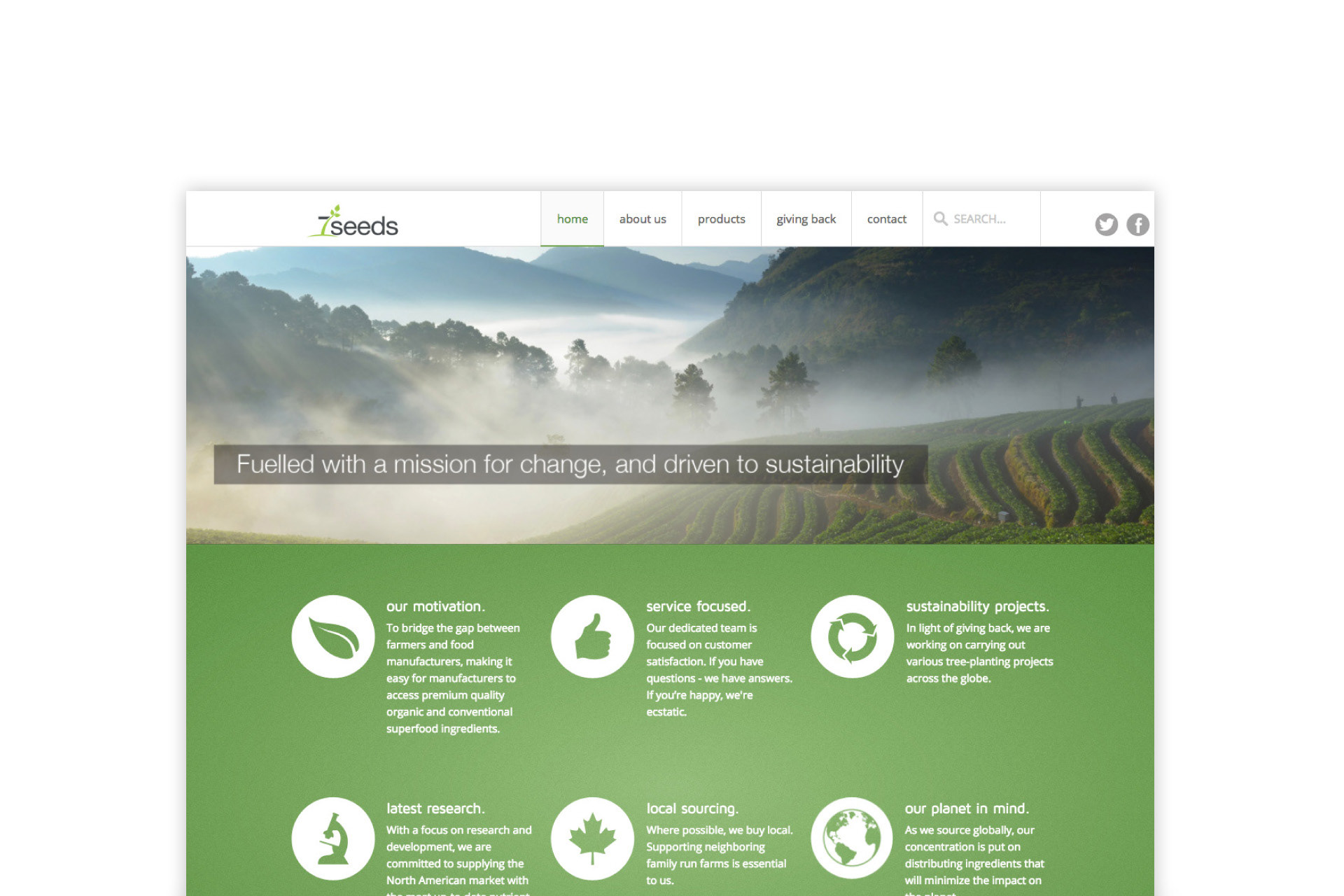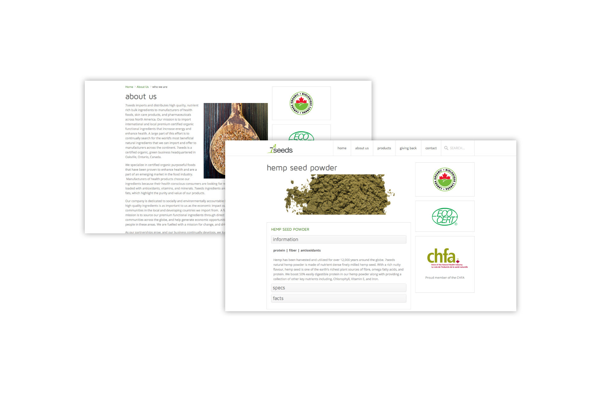 Website and business card designed for 7seeds, an importer and distributer of bulk foods in Canada, with sustainability as the focus. Business cards printed on recycled material.