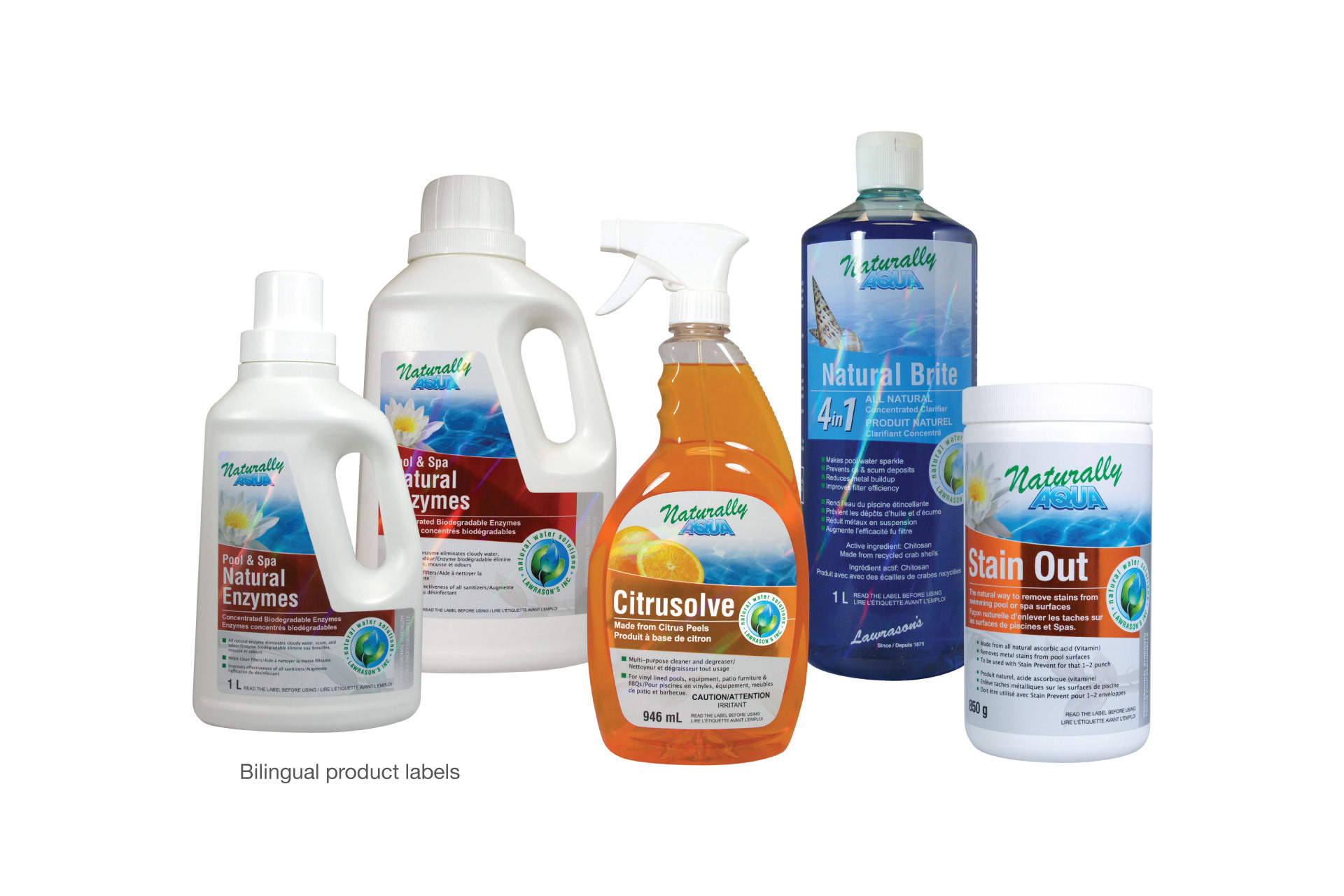 Labels created for Naturally Aqua, a line of environmentally-friendlier pool care chemicals in Canada.
